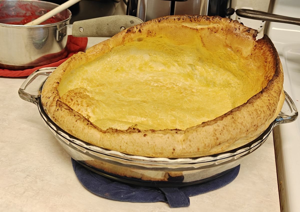 Preheat oven to 425° F. Put the butter in a cake pan (8”×8” for a thick pancake, bigger for a thinner one) and put in the oven to melt.